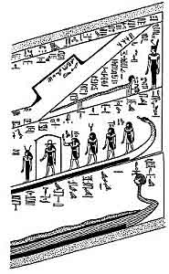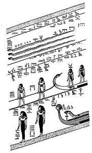 Ra en de Goden, die zijn bemanning vormde, hebben de tot nu toe gebruikte boot verlaten en hebben zichzelf naar een ander begeven, een boot waarop aan elk uiteinde het hoofd van een slang zit.