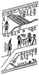 1. Een grote boot, met aaaan elk uiteinde een vrouwenhoofd, liggend langs de bodem van de boot is de slang HETCH-NAU.
