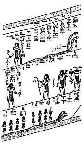 Deze slangenboot wordt getrokken door vier Goden, die zijn genaamd TUN-EN-MAA, HER-UARFU, AR-NEFERTU en SHETAI.