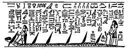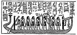 Voor hem staan, HEKA-SER, Saa en Isis, die haar beide armen gestrekt voor zich houdt de woorden van macht opzeggend waardoor de boot verder zal doen vorderen.
