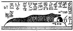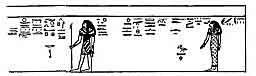 4. Een God in menselijke vorm, gezeten op een troon en met pluimen en een uraeus op zijn hoofd, met “leven” in zijn rechterhand en een scepter in zijn linker, deze God heet AFU-ASAR (Afb. 8) en hij zit onder een baldakijn die wordt gevormd door het lichaam van de monsterslang genaamd ANKH-ARU-TCHEFAU-ANKH-ARU.