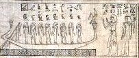 In de boot staan Shu, Tefnut, Geb, Noet, Osiris, Isis, Horus en Hathor.