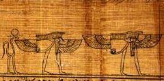 Twee gevleugelde udjat-ogen op mensenbenen, gevolgd door een slang met benen, horens en een zonneschijf dragend.