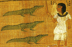 Vignet van Pc3 (18de dynastie) toont N. een krokodil spietsend met een wꜢs-scepter. (Zie afb. hieronder)