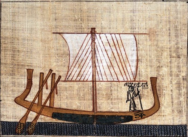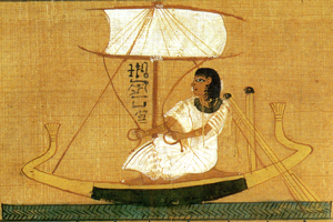 Nakht knielt in een kleine boot met een voor- en achtersteven in de vorm van een papyrus, twee touwen vasthoudend om het opzwellende zeil te controleren.