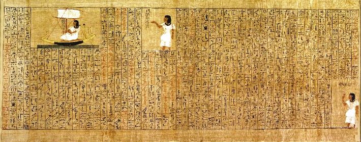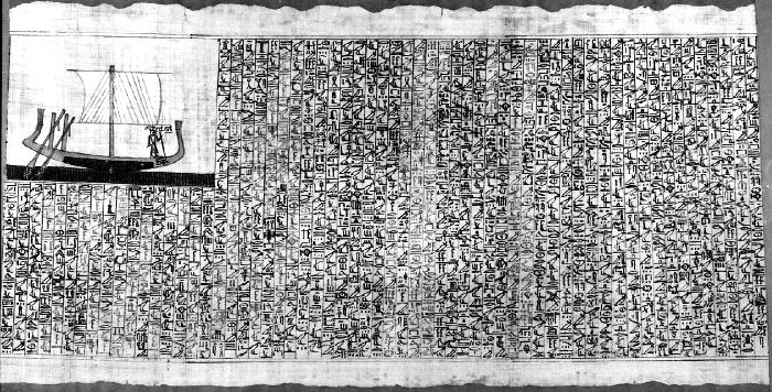 Vandaar dat de veerman is afgebeeld in de manuscripten van het Boek der Doden, zittend in een boot met zijn hoofd achterwaarts gekeerd.