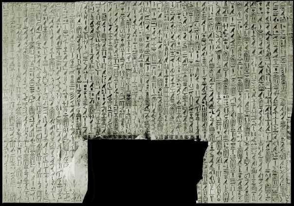 Afbeelding van de oostelijke muur uit de voorkamer van de piramide van Unas.