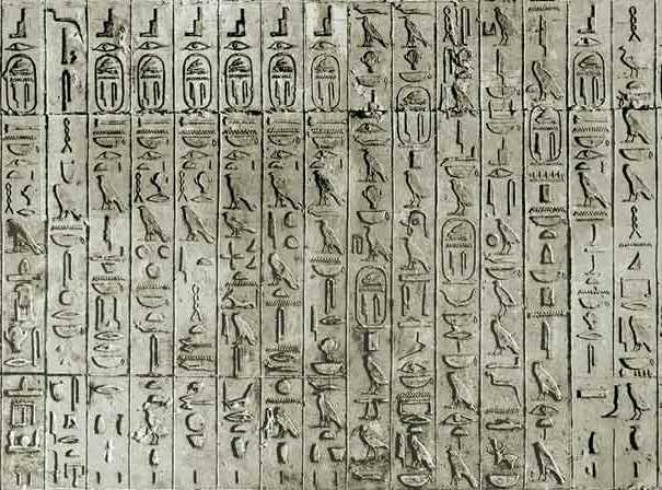 Afbeelding van de piramideteksten in de sarcofaagkamer van Unas, noordzijde.