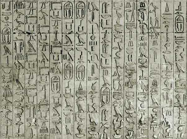 Afbeelding van de piramideteksten in de sarcofaagkamer van Unas, noordzijde.