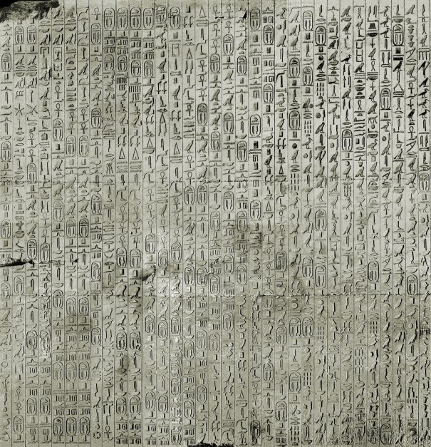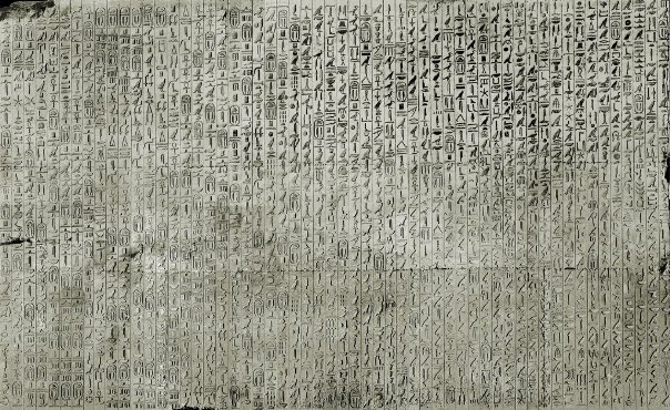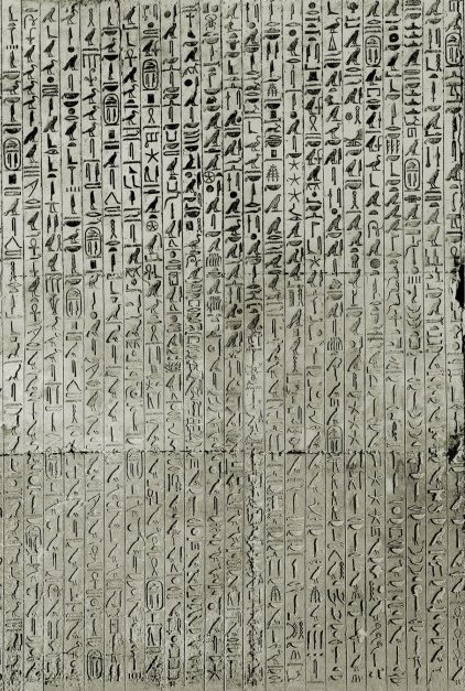 Afbeelding van de piramideteksten in de sarcofaagkamer van Unas, zuid muur (detail links).