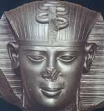 Hij draagt de traditionele koninklijke nemes-hoofddoek, met een beschermende uraeus-slang op het voorhoofd.