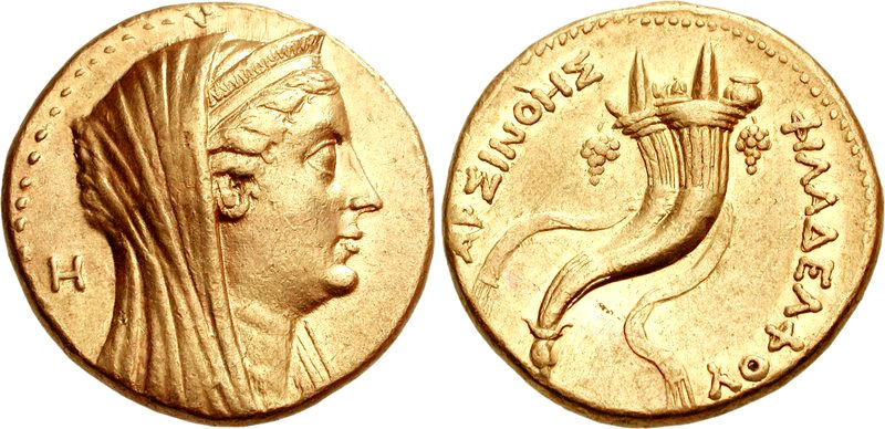 Gouden munt van Ptolemaeus II Philadelphos (285-246 v. Chr.), Arsinoe II op voorzijde.