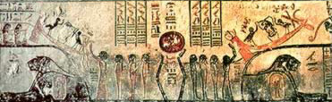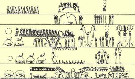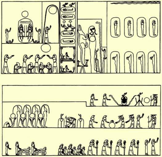 Onder is de opstanding van het lijk van de zon, een scène die zich voordoet in de koninklijke sarcofaag kamers te beginnen met Merenptah en later vaak op de papyri van de 21e dynastie.