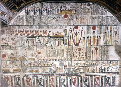 De eerste scène bestaat uit vier ovalen die mummies bevatten, toegestaan om te ademen door de stralen van de zonnegod.