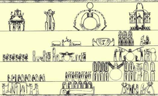 Aan het einde van dit deel van het “Boek der Aarde“, begint het bovenste gedeelte met een afbeelding van een enorme grafheuvel, die de zonneschijf bevat en een godheid er naar toe biddend.