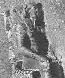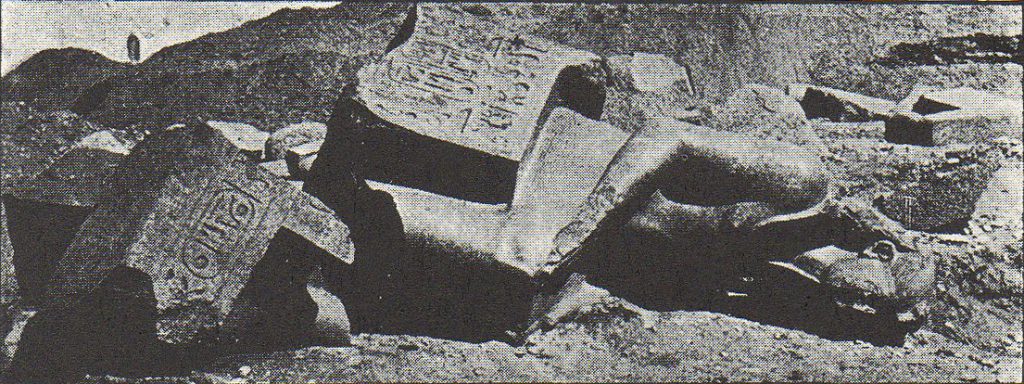 Foto van een groot syeniet beeld van Imiremesha tijdens de opgravingen in 1897 bij de Grote Tempel van Tanis onder leiding van Flinders Petrie.