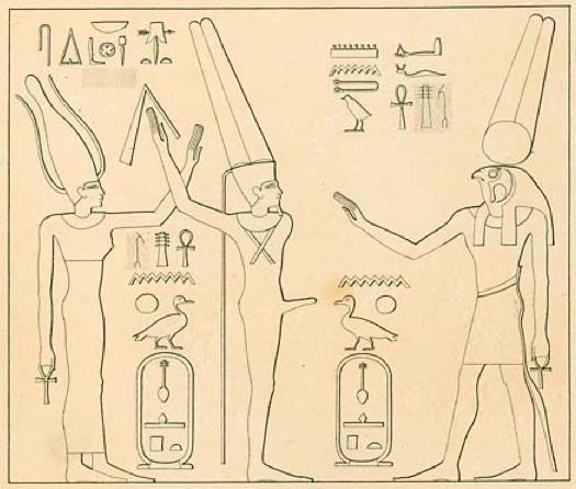 Tekening door Karl Richard Lepsius van een rotsinscriptie van Konosso met Montu, Min en Satet met de cartouches van Neferhotep I