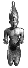Bronzen standbeeld, voorstellend de koning knielend tijdens het offeren.