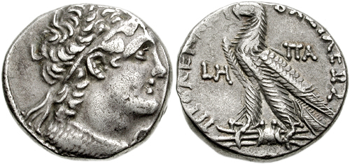 Zilveren tetradrachme van de Egyptische farao Ptolemaeus IX Soter II.