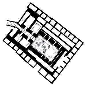 Binnenin is een begraafkamer met de afmetingen 10,00 x 5,00m en een paar rijen met additionele kamers.