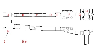 De gangen (B,C,D) zijn merkbaar afgekort, zoals in Ramses IX (KV6), er is slechts een korte gang (G) die leidt van de hal met pilaren (F) naar de hal met de sarcofaag (H), welke is ongewoon met zijn 4 rechthoekige pilaren en met de diepe (meer dan 10 m) centrale begrafenis schacht, vermoedelijk bedoeld als additionele veiligheid maatregel.