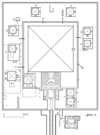 De piramide en de dodentempel waren omringd door een tweetal muren, in de ruimte tussen deze muren zijn de tombes ontdekt van leden van de koninklijke familie en hof-dienaren.