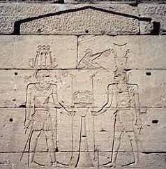 Zonnegod van Neder-Nubié, Mandoelis draagt een kroon van ramhorens, bedekt met hoge pluimen, zonneschijven en cobras.