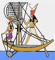 Veerman Nemty brengt Isis over de rivier in zijn boot naar “Het eiland in het midden“.