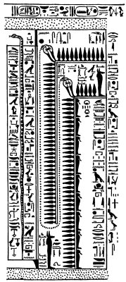 3. Twaalf bebaarde wezens, die elk met beide handen het lichaam van een slang vastpakken, zij zijn genoemd “DE HOUDERS VAN DE PERIODE DER TIJD IN AMENT”.