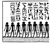 De Aamu, d.w.z. de Aziaten. De Reth, d.w.z. de Egyptenaren. (uiterst rechts) Horus.