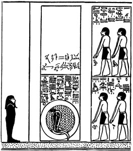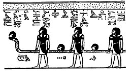 2. De Goden KHERU-AMU-PERERU-TEPU-EM-QEBU-F en de monsterslang SEBA-APEP (Afb. 10), van wie het lichaam boven de grond wordt gehouden door twaalf bebaarde Goden, zij worden beschreven als: “Zij die voedsel hebben als de hoofden uit zijn kronkels tevoorschijn komen”.