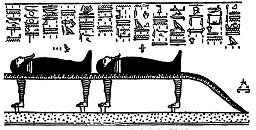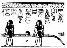 2. De slang NEHEP, wiens lange lichaam is gemaakt om te dienen als baar voor twaalf Goden in gemummificeerde vorm, het lichaam van de slang is voorzien van 24 leeuwenpoten en een gemummificeerde God rust boven elk paar daarvan. (Afb 18 en afb. 21)